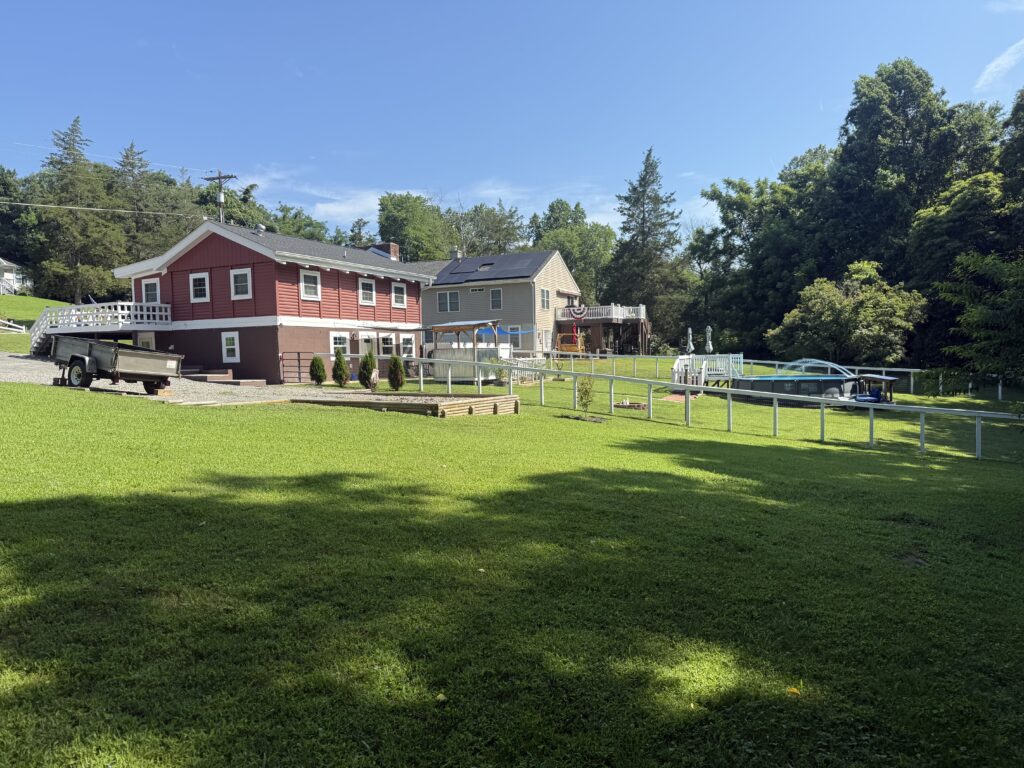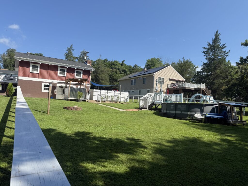 Blue Ridge Shores Community is a sought-after golf cart loving gated Lake Community nestled in the foothills of Louisa County. This lake access home stands at point and observes your .90 acres of pure luxury; with a backdrop of trees to the back, providing a privately fenced back yard which is enclosing your own backyard pool to escape to. Smell the steaks grilling on the grill from the culinary BBQ haven as you work on that fabulous summer tan. You will find a patio area designed to entertain and plenty of room to play. The front deck is placed to host a lounge area and sitting area pointing to the Lake, listen and you can hear the boats and giggles off in the distance. The front door harbors a wide foyer and opens to a breathtaking view of the open wood beams of the ceiling taking the space to heights. The light fixtures are a perfect accessory and assist nicely to create that perfect lake house feel. The stone fireplace sure makes a statement as well as a designated area to anchor your tv. The floors are a beautiful hardwood laminate that shine like a guiding light throughout. The Upper Main level is steward to the sleeping quarters and offers a pristine full bath. Stairs to the Lower Main level with a cutout to the large family room connects all the spaces and trails you downward. The Laundry/Mud Room area is located on the lower level. You will also enjoy a pantry for your hungry crew and huge storage space. The upscale laminate hardwood steers you throughout the entire lower level connecting you to each designated space. A full bath designed to be its own adornment with tiled stand up shower, farm style sink and shelves for those extra towels and accessories. Scoot on down the hall and grab something to eat in your gourmet kitchen with breakfast bar and cupboard space for days. Standing at attention is another captivating fireplace, setting off a fiery glow. The mantle has a powerful stance across the wall providing order for your electronic devices. The Dining/Family Room combo is the perfect combination for this lower level boasting an oversized area for couches and chairs to lounge around and relax upon. Head outside for grilling and pooling or to sit under the stars. Gated and fenced area for some fun activities enjoying the pool, making smore’s over the campfire or flipping the burgers and hot dogs creating a smoke-kissed oasis. Protection is essential and you’ll find it with a fenced backyard, large enough to arrange any agenda. As your guests need to use the indoors, they will be delightfully escorted with updated flooring, paint and meticulously chosen light fixtures and treasures adding to the charm and character of this lake home. For parking, there is a generous 24 X 24 garage and canoe/kayak storage on the side. The driveway is large so you will be able to fit your camper and many vehicles. The Lake Access is steps away from your driveway so head over for the best fishing around! As you head out, go the opposite way and head out the back gate so you can go see the toe worthy Main Beach and amenities area – water feels great! – :: HIGHLIGHTS & UPDATES :: – 2025 New flooring – fresh paint & new light fixtures & new flooring – 2 lots = .90 Acres – New 3 ton HVAC system | 2022 – New roof | 2022 – Renovated primary Bath | 2022 – New kitchen appliances | 2020 – New gutters | 2020 – New electric hot water heater – 18 x 52 Round above ground pool – Patio Sail curtains to create shade in your sun-kissed yard. Your home is protected with a generator hook-up already installed and ready for any unseen event. Keeping your home and family warm, lite and running are essential. This gives you peace of mind when Mother Nature becomes unruly. Added Security – The backyard is fenced providing your family security when outdoors. The fenced in area encompasses the backyard entertainment from the patio – sitting area, BBQ station, pool, campfire pit. Check it out today!